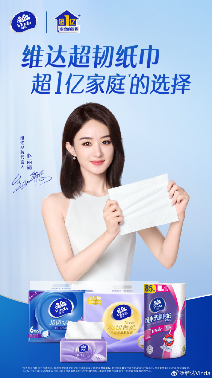 維達(dá)作為知名的衛(wèi)生紙品牌,維達(dá)官宣品牌新代言人趙麗穎。這次維達(dá)以“韌性”作為宣發(fā)的主要主題,主打維達(dá)超韌紙巾、棉韌奢柔羊絨感紙巾等系列的產(chǎn)品,宣言“堅(jiān)持以韌性品質(zhì)為超1億家庭帶來高品質(zhì)生活衛(wèi)生用紙和服務(wù),悉心呵護(hù)國(guó)民家庭健康生活中的每一觸?!?