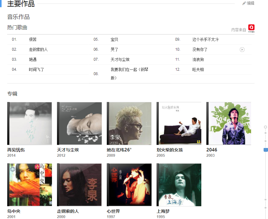 2003年,李泉其演唱的歌曲《流浪狗》獲得“第26屆香港十大中文歌曲獎”全國最受歡迎中文歌曲獎 ;同年10月13日,李泉推出第五張個人音樂專輯《2046》,收錄了包括《花花大世界》、《這個殺手不太冷》等在內(nèi)的10首歌曲 。2004年,獲得“第二屆東南勁爆音樂榜”內(nèi)地勁爆最佳唱作男歌手獎;同年,與范瑋琪、徐懷鈺、林依輪、范曉萱等共同為浙江電視教育科技頻道演唱了主題曲《新青年制造》 。2005年10月25日,推出第六張個人音樂專輯《劃火柴的女孩》,收錄了包括《沒有你的情人節(jié)》、《眼色》等在內(nèi)的11首歌曲,整張專輯融入了拉丁音樂、西班牙音樂、爵士樂、搖滾樂等多種不同的音樂元素 ;同年11月,獲得“中國風(fēng)尚大典”內(nèi)地風(fēng)尚男歌手獎 ;同年12月29日,李泉獲得“中國原創(chuàng)音樂流行榜”最佳內(nèi)地創(chuàng)作歌手獎 。2006年3月25日,李泉獲得“第13屆東方風(fēng)云榜頒獎盛典”最受歡迎男歌手獎 ;同年,李泉擔(dān)任鐘漢良個人單曲《風(fēng)和日麗》的制作人 。2007年,李泉為傅沖創(chuàng)作歌曲《愛又二分之一》 ;同年,李泉擔(dān)任厲娜首張個人同名專輯《厲娜》的制作人 ;之后,李泉擔(dān)任趙薇個人音樂專輯《天使旅行箱》的制作人。2009年5月20日,李泉推出首張個人EP專輯《她在北緯26°》 ;同年6月,李泉擔(dān)任東方衛(wèi)視選秀娛樂節(jié)目《加油!東方天使》的評委 ;隨后,李泉憑借歌曲《眼色》入圍“第20屆臺灣金曲獎”最佳作曲人獎 ;同年,李泉擔(dān)任香港TVB歌唱選秀節(jié)目《超級巨聲》的評委 ;隨后,擔(dān)任“誰最閃亮校內(nèi)星歌榜”歌唱比賽的評委 。2010年4月24日,李泉獲得“中國TOP排行榜頒獎典禮”內(nèi)地年度最佳制作人獎 。
