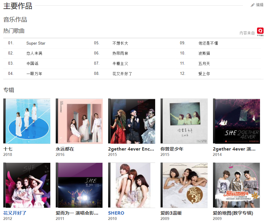 2000年共同參加《宇宙2000實力美少女爭霸戰(zhàn)》后受華研國際音樂相中并簽約。2001年9月11日發(fā)行首張專輯《女生宿舍》正式出道,憑借此專輯入圍第13屆臺灣金曲獎最佳新人獎 。2002年發(fā)行專輯《美麗新世界》并獲得第十四屆臺灣金曲獎獲得最佳重唱組合獎。2003年發(fā)行專輯《Super Star》入圍在第十五屆臺灣金曲獎最佳重唱組合獎 。2004年發(fā)行專輯《奇幻旅程》入圍第十六屆臺灣金曲獎最佳重唱組合獎 ,同年舉行首場世界巡回演唱會。2005年發(fā)行專輯《不想長大》入圍第十七屆臺灣金曲獎入圍最佳重唱組合獎 [8] 。2006年舉辦《S.H.E移動城堡世界巡回演唱會》。2007年發(fā)行專輯《Play》,憑借專輯主打曲《中國話》首次登上央視春晚表演。2008年發(fā)行專輯《我的電臺FMS.H.E》。2009年舉辦《S.H.E愛而為一世界巡回演唱會》;2010年發(fā)行專輯《SHERO》并宣布單飛不解散。2012年發(fā)行專輯《花又開好了》。2013年受中央電視臺春節(jié)聯(lián)歡晚會邀請并獻唱歌曲《SHERO》,3月舉辦巡回演唱會《2GETHER 4EVER 世界巡回演唱會》。2014年舉行《2GETHER 4EVER世界巡回演唱會安可場》 。2015年為內(nèi)地電影《少年班》獻唱主題曲《你曾是少年》。2016年8月推出EP《永遠都在》。